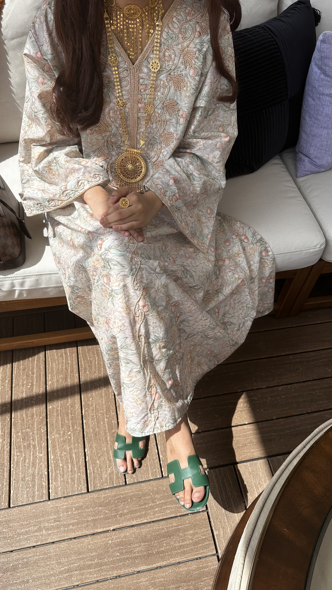 طول الكم لجميع المقاسات: ٢١ انش/ عرض الصدر لجميع المقاسات: ٢٥ انش/ ملاحظة: قد تختلف الوان التطريز من قطعة الى اخرى اختلافا بسيطًا، نوع القماش قطن ايطالي/